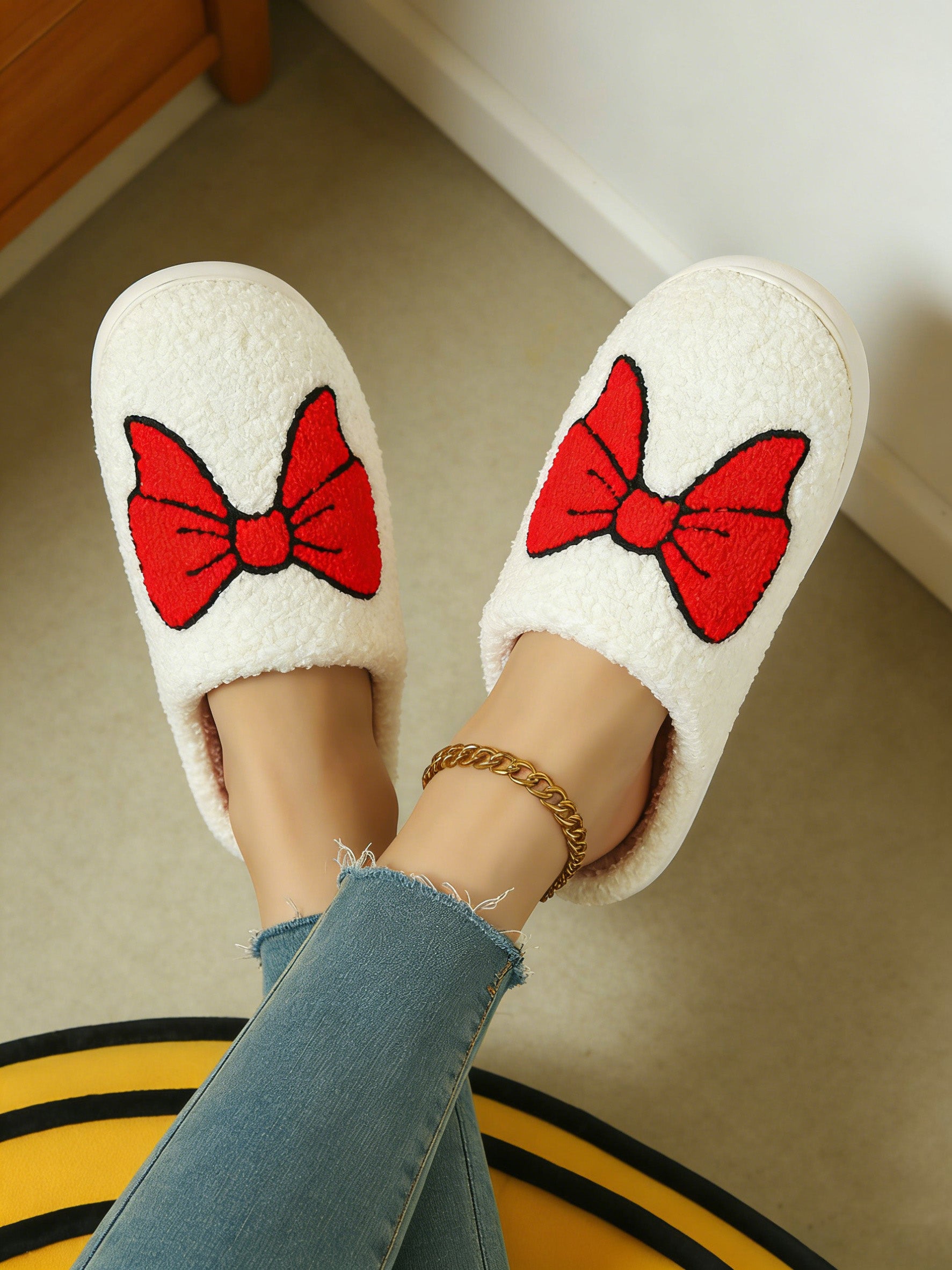 Bulk Slippers | Unisex Red Bow Embroidery Fuzzy Slippers Winter Warm Indoor Home Shoes Wholesale